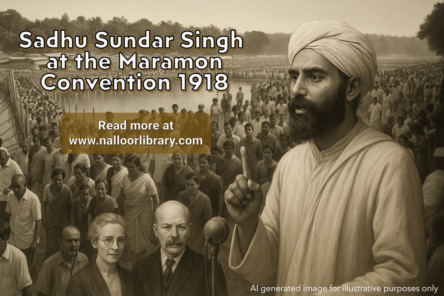 Sadhu Sundar Singh at Maramon Convention 1918. Also seen is Rev. Arthur Parker (the fourth LMS missionary in Trivandrum) and his wife Mrs. Rebecca Arthur Parker the author of the book – Sadhu Sundar Singh, Called of God (1920). (AI generated image for illustrative purpose only)