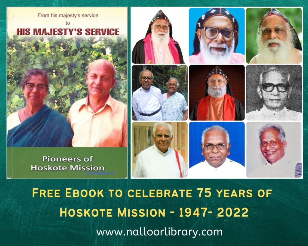 On 26th June 2022, Hoskote Mission will celebrate 75 years (Platinum Jubilee). The Hoskote Mission Medical Center was established in 1947 in Hoskote, Bangalore Rural District, Karnataka by two missionaries Mr. M. T. Joseph and Mr. A.C. Zachariah along with their wives Mariamma Joseph and Saramma Zachariah. As part of this historic moment, Nalloor Library presents a free Ebook version of – ‘From his majesty’s service to His Majesty’s Service’ (Pioneers of Hoskote Mission) released in December 2003.