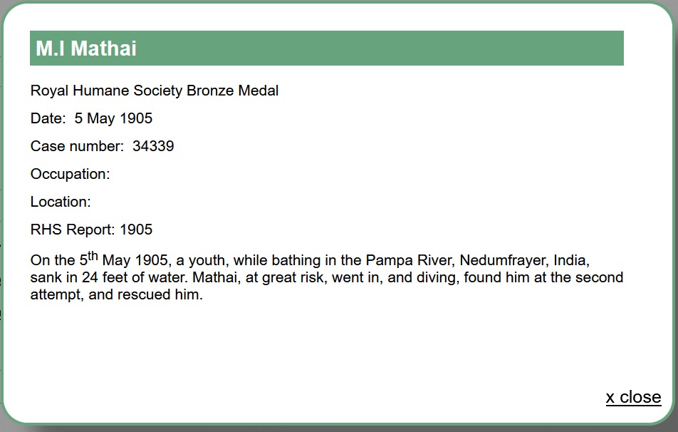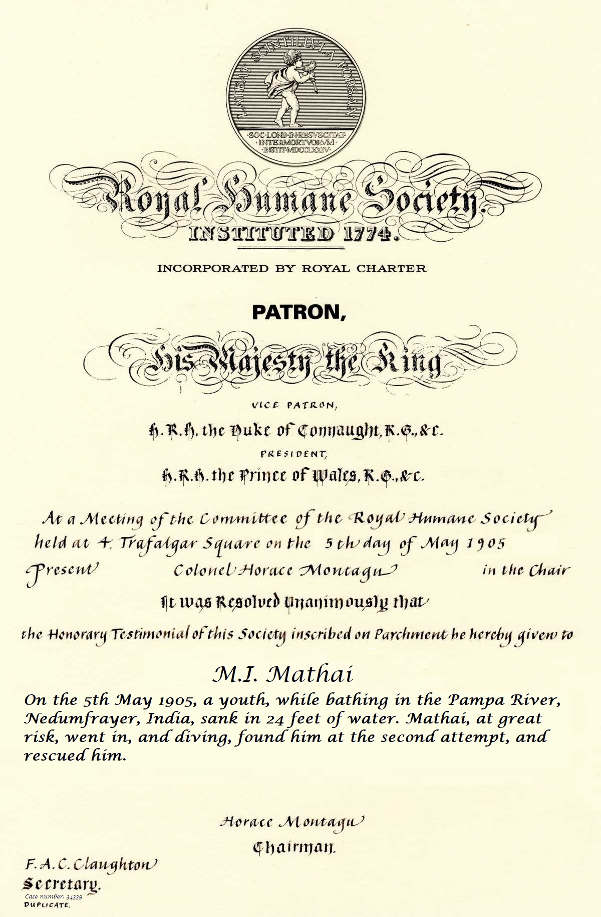 On 5th May 1905, while bathing in the Pamba (Pampa) River, Nedumbrayar, Pathanamthitta, India a young man sank in 24 feet of water. Mathai, at great risk, dived in. He found him in the second attempt and rescued him. It was for this courageous rescue that he was duly recognised and awarded the medal with a certificate.