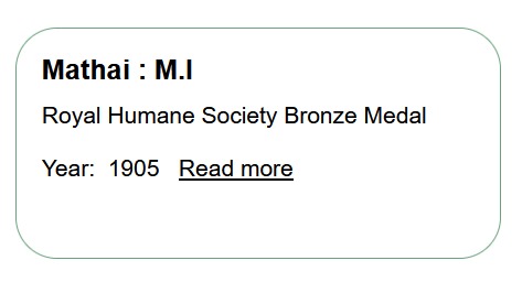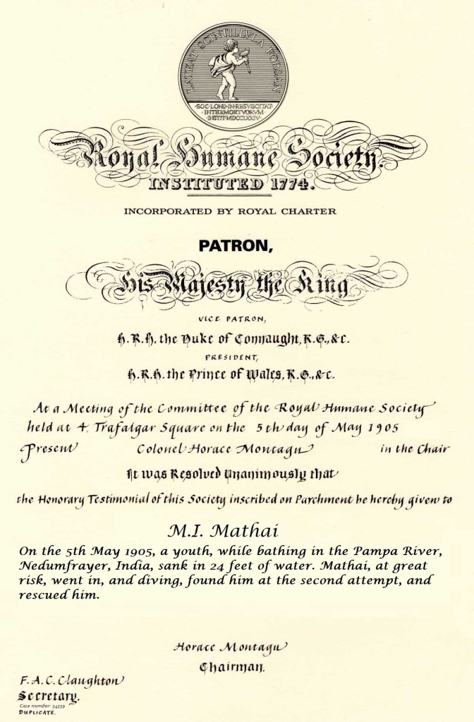 Manon Ipe Mathai was awarded the ‘ROYAL HUMANE SOCIETY BRONZE MEDAL’ in 1905 for putting his own life at great risk to save someone else’s. He may be the first Travancore citizen to receive such an award during the British Rule in India.