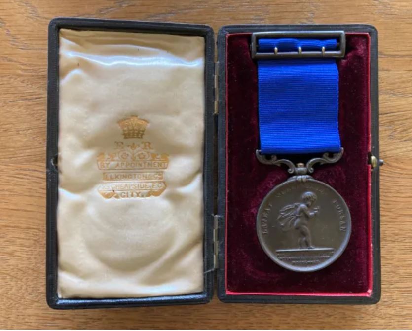 The Royal Humane Society Medal was established in 1774. The Medal was initially awarded to personnel in recognition of lifesaving acts or attempts to save a life from drowning. The award of the Medal was later expanded to reward all acts of exceptional bravery in rescuing or attempting to rescue persons from mines, wells, blasting furnaces, or in sewers. The medal features a Latin inscription on the reverse which translates to “He Has Obtained this Reward for Saving the Life of a Citizen.”
