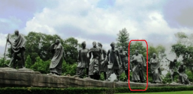 “Gandhi’s iconic retinue in the sculpture includes a woman with her head covered following close after him; a cluster of three men including a turbaned Sikh visibly of high pedigree, a Hindu scholar with a topi and an emaciated Muslim peasant; a Hindu man wearing a turban as a mark of intellectual distinction, with a religious mark etched on his forehead; an impoverished peasant looking far ahead, bearing no marks of class, caste or religion on his body; a Christian priest; another woman in a skirt and a young boy egging on a weary old man to travel farther.” ~ www.sodelhi.com