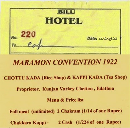 Fourteen meals for One rupee. During the early years of the Convention, restaurants and hotels were not in existence. Kappi Kadas (coffee/tea shops) and Chottu Kadas (rice shops) were the only available eateries at the Manalpuram (river bed) venue of the convention. One of the famous chottu kada’s was managed by Kunjan Varkey Chetten from Edathua. He would serve 14 full meals for just one rupee and 228 full glasses of black coffee (Chakkara Kappi) also for Rs.1 in the early 1920’s.
